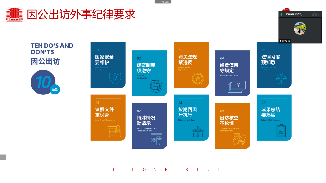 学校高度重视因公出访行前教育培训工作,始终要求严格落实学校、学部(院)双重行前教育,严明外事纪律,关注师生安全,有效保障学校师生平安出行。