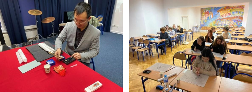 在书法体验中,孔院志愿者教师王鸿泉向学生们介绍了汉字的起源、演变与特征,以及书法的哲学内涵及功用,还与初识中文的学员们一起做甲骨文与现代汉字连线等趣味游戏,培养他们学习汉语的热情与信心。在优雅款款的古筝伴奏中,老师手把手带领学生们用毛笔练习了“你好”“中国”“波兰”“我爱你”等日常用词,学写中文名字,深受学员喜爱。