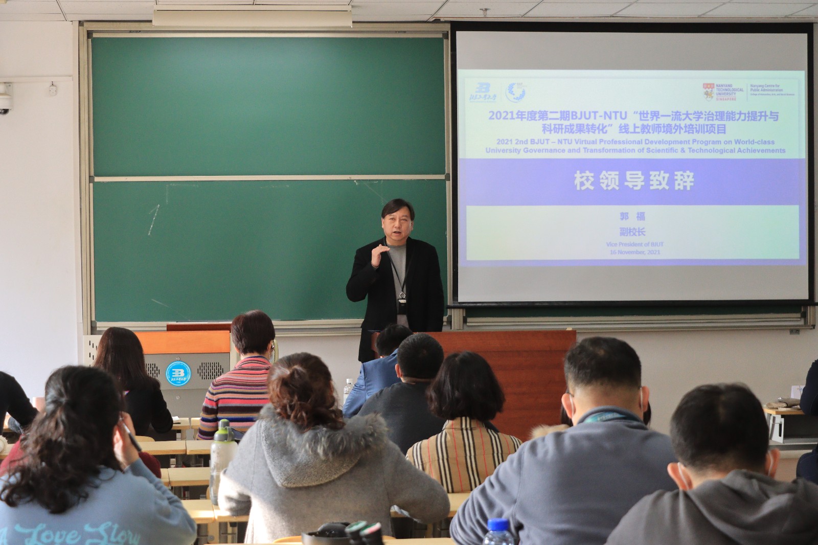 北工大2021年度“世界一流大学治理能力提升与科研成果转化”线上教师境外培训班由新加坡南洋理工大学承办,于11月16日至12月16日间每周二、周四下午以“线上云端授课,线下集中听课”的方式进行,共计10节课,30个课时,40名教职员工参加。