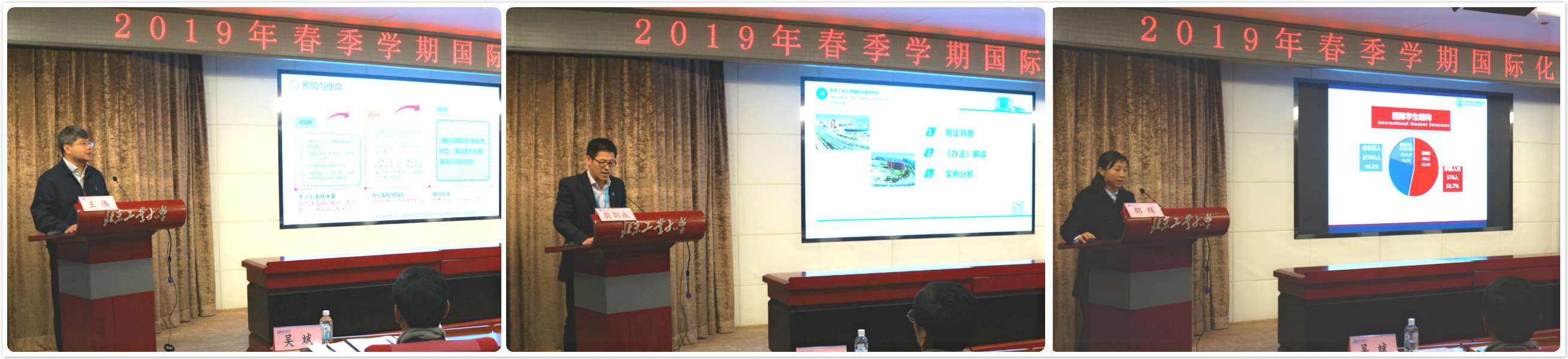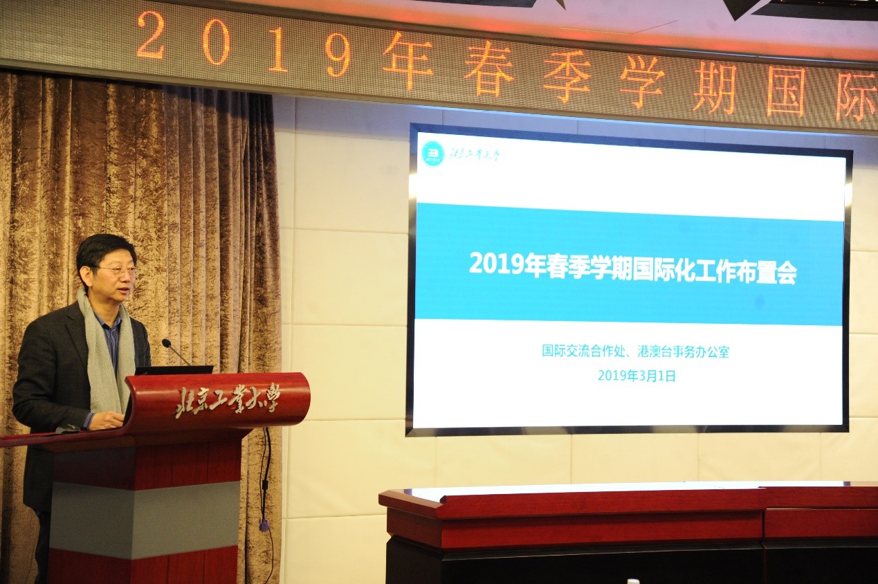 吴斌副校长在讲话中指出,北工大2018年国际化工作取得的各项成果离不开大家的共同努力,“一带一路”成为学校国际化工作的亮点,引以为傲的同时,也要直面机遇与挑战。学校2019年工作要点中有7项国际化重点工作,希望大家依托“一核两翼”“281”全球合作网络,促进国际化人才培养和国际科研合作,切实做好“两完善、两提高、七落实”。他对国际化工作队伍提出三点要求:第一,认真学习、领会上级精神,形成共识,共同推进北工大国际化进一步深入发展;第二,积极稳步推进国际化重点工作、做出亮点,应结合“一院一品”和年度工作要点,从学院顶层设计入手,在国际化人才培养、国际化师资队伍建设、国际化工作队伍管理等方面积极主动作为;第三,做好协调、抓好落实,既要有学院自己独特的发展亮点,又要加强学院与学校、学院内部的协作,共同推进学校国际化发展。