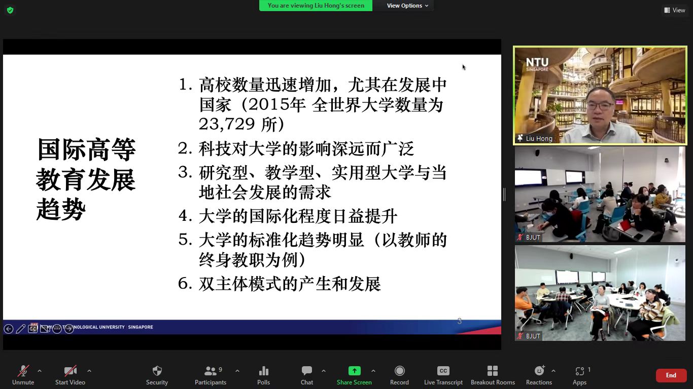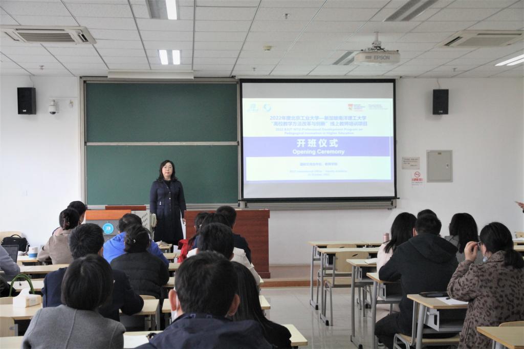 为全面贯彻党的二十大精神,深入落实教育优先发展、人才引领驱动、扩大教育开放等重要指示,北工大特此联合新加坡南洋理工大学组织举办第三期线上教师境外培训,旨在开拓教职员工国际视野,提高国际化教学能力与管理水平。本期培训以“高校教学方法改革与创新”为主题,于10月25日至11月24日间以“线上云端授课,线下集中听课”方式进行,共计10节课,30个课时。经遴选推荐,来自14个相关职能部处及学部院的40名教学、科研及管理骨干参训。
