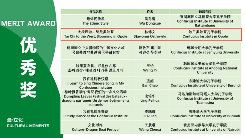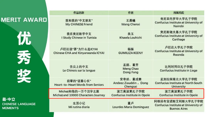 近日,由中国国际中文教育基金会主办,中国教育出版传媒集团支持的第二届“最·孔院”全球短视频征集活动圆满落幕。我校共建孔子学院及下设孔子课堂积极参与,由北工大-波兰奥波莱孔子学院(以下简称“孔院”)选送的两个短视频“Michal和他的一万个汉字之旅”和“太极西游,绽放奥波莱”入围2022年“最·孔院”全球短视频百部作品名单,并荣获“最·中文”“最·文化”优秀奖。