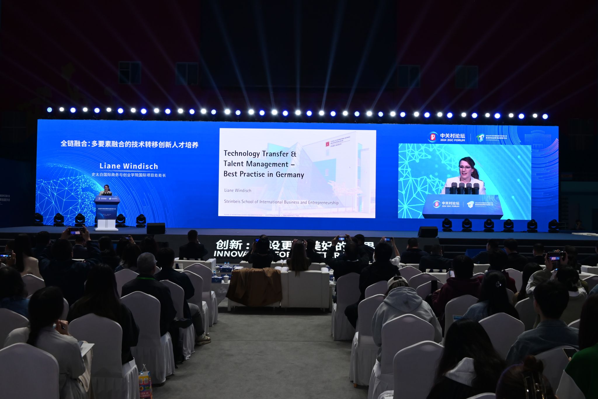 4月29日,史太白国际商务与创业学院国际项目处处长莉安妮·温迪施在2024中关村论坛高校科技成果转化促进大会上作题为“全链融合:多要素融合的技术转移创新人才培养”的主旨报告,与到场嘉宾及现场观众深入互动交流。