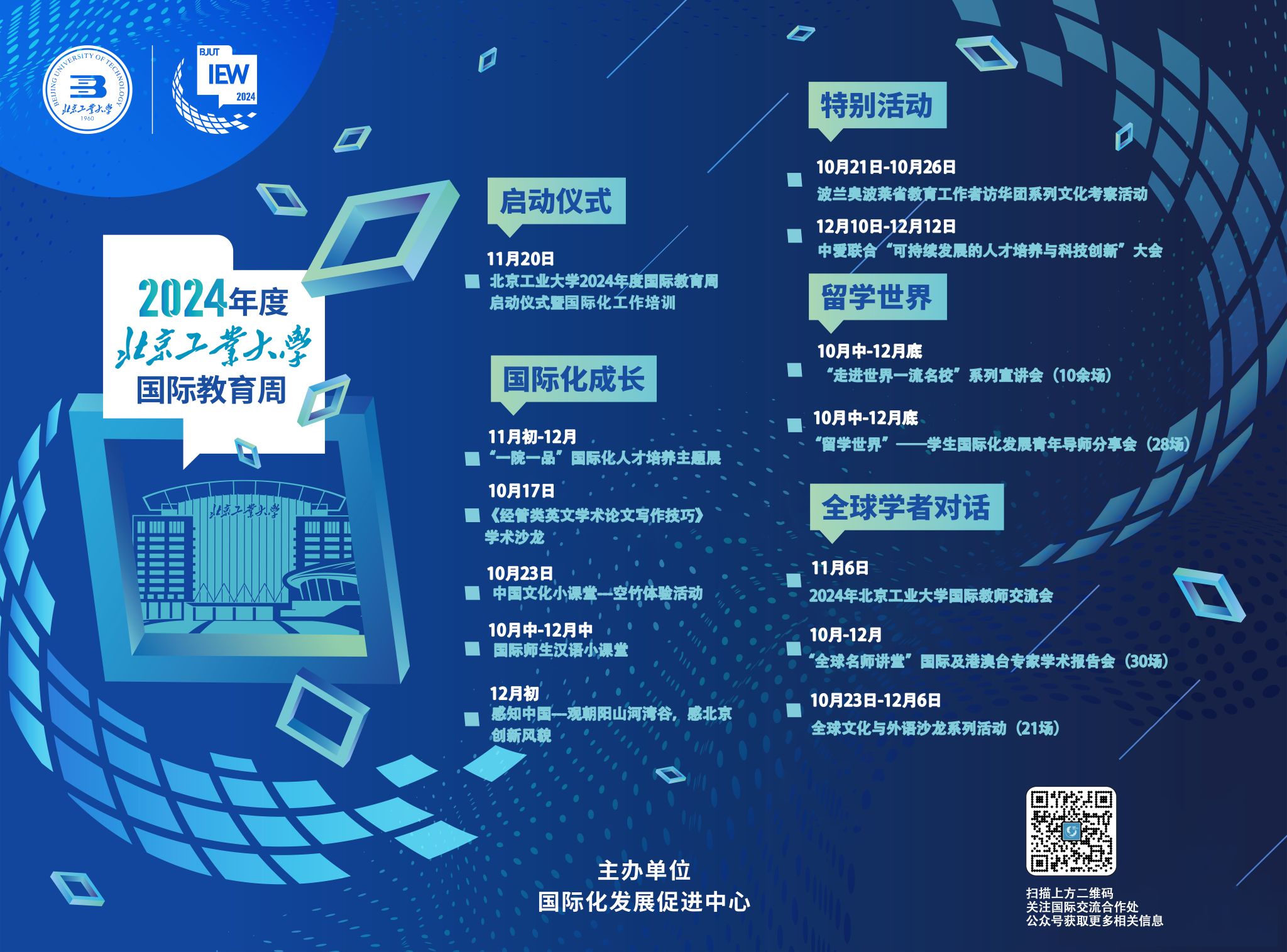 为深入实施学校国际化发展战略,汇聚国际化教育资源,凝聚国际化工作力量,学校于10月中旬至12月上旬期间举办2024年国际教育周系列活动。包括5大版块、一院一品主题展、60余场国际项目宣传、留学经验分享、全球学术报告及21场外语沙龙系列活动,积极营造国际化校园氛围,打造国际化活动品牌。