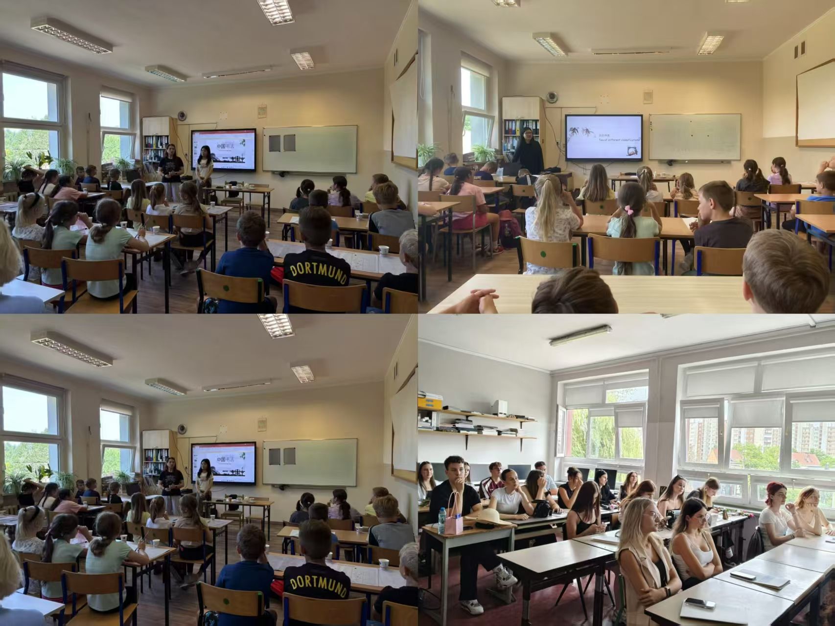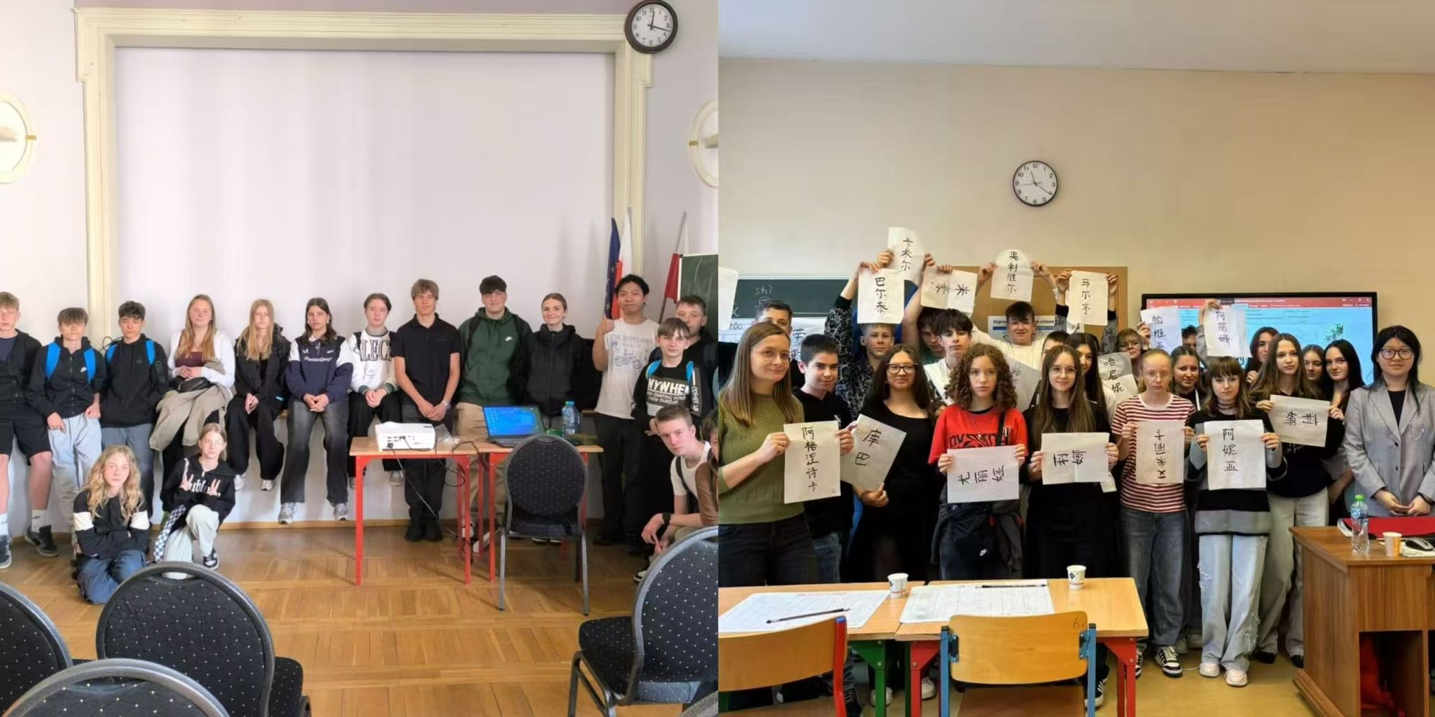 5月,在奥波莱市第五中学开展文化交流活动,教师通过讲解中国城市风貌与汉字演变等,带领大家穿梭于中国城市的空间肌理与文字传承的时间纵深,并指导学生书写、对比中波语言,引导学生感受中国文化的深厚底蕴。