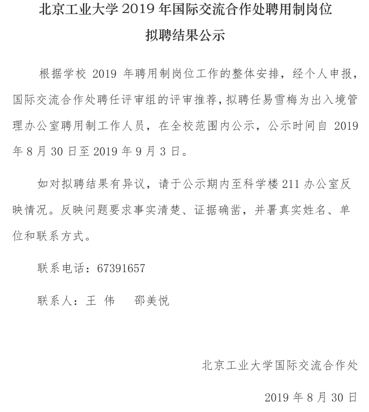 伟德国际唯一官网入口2019年国际交流合作处聘用制岗位拟聘结果公示